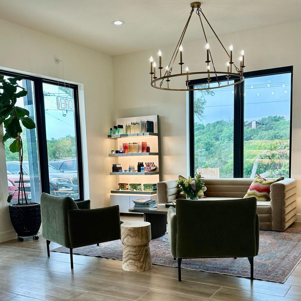 The salon’s stations feature quartz countertops and double-sided mirrors, providing plenty of space and storage for both clients and stylists. One of the standout features of the salon is the large windows that offer stunning views of the surrounding trees, creating a serene and welcoming atmosphere.