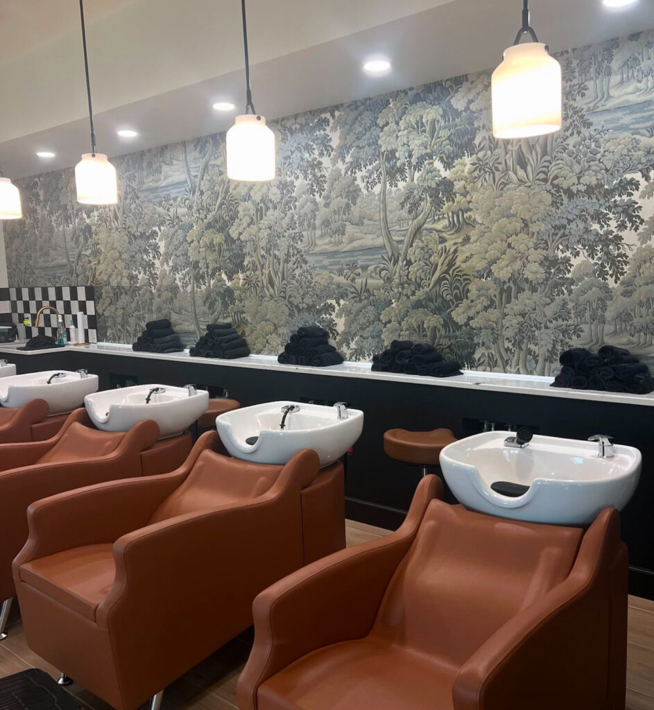 The shampoo area at Gold Dust Hair Studio is both relaxing and functional. With beautiful wallpaper and strategically placed lighting, it creates a serene environment. A hidden gem in this area is a depiction of Mother Nature, reflecting the salon’s connection to the surrounding natural beauty.